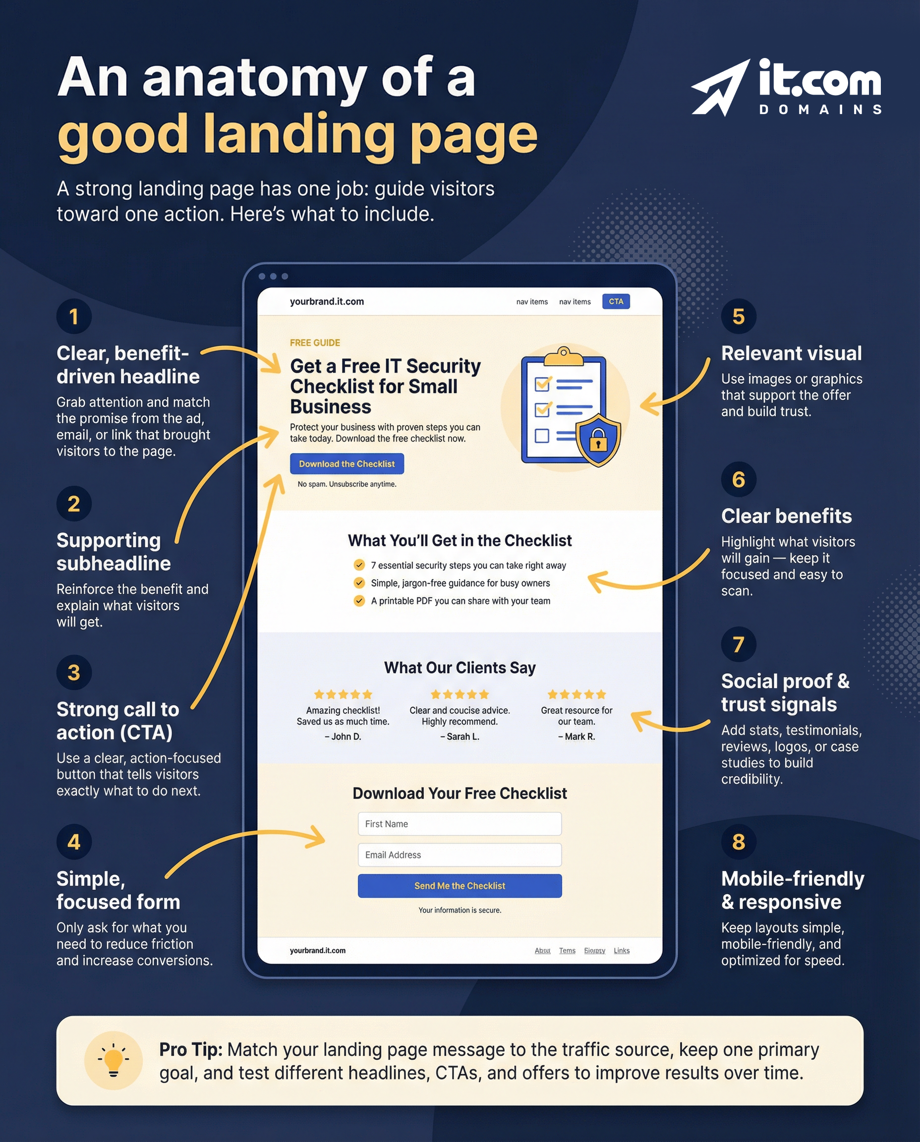 A good landing page usually has a clear headline, one strong call to action, relevant copy, trust signals, and a simple layout that works well on mobile. The best landing page examples also closely match the message that brought the visitor there in the first place.